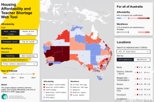 Existing resources include the Housing Affordability and Teacher Shortage Dashboard, a time series interactive map of housing and rental costs against teacher salaries in Australia. Plans are underway for further data infrastructure resources linking education, housing and social data.